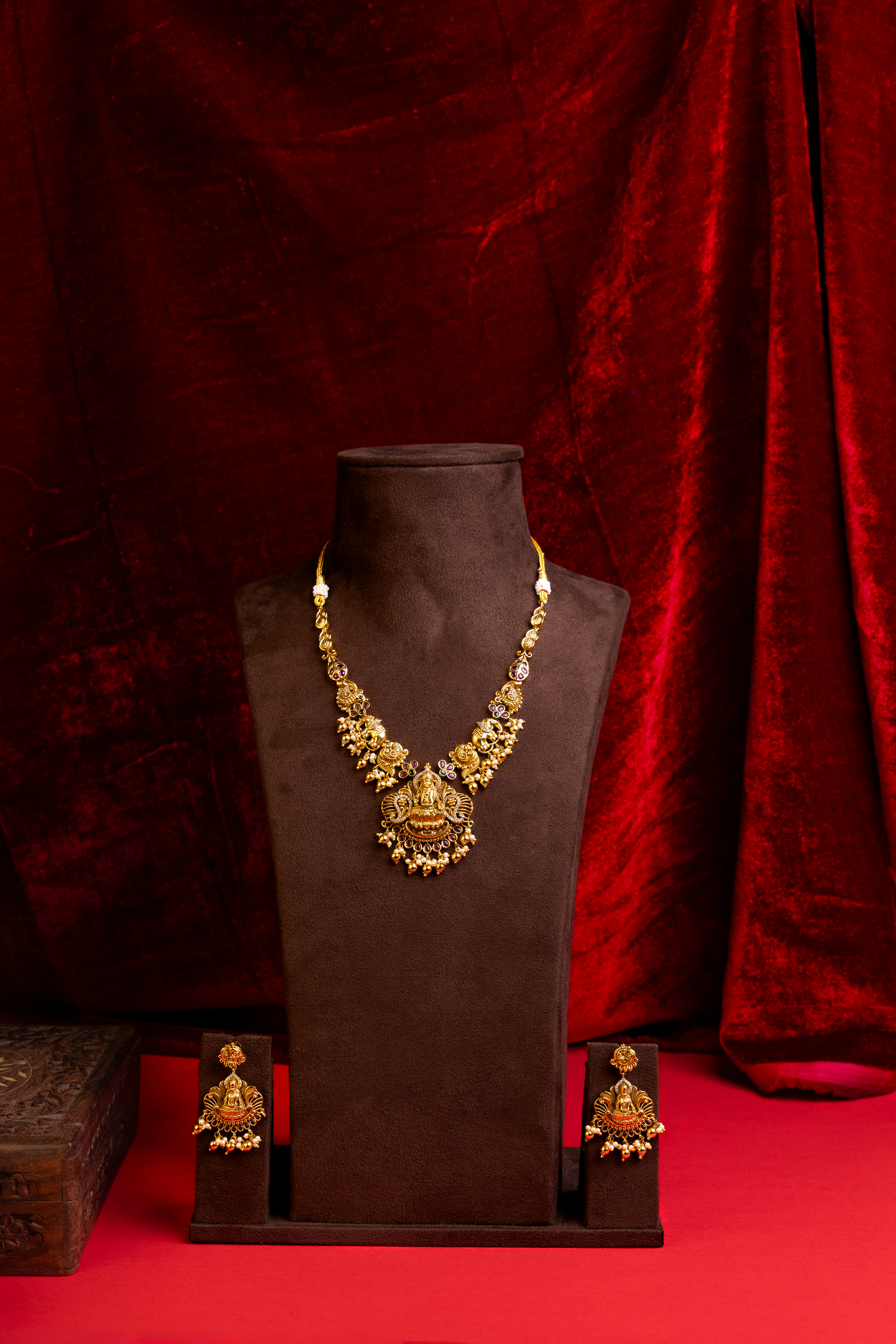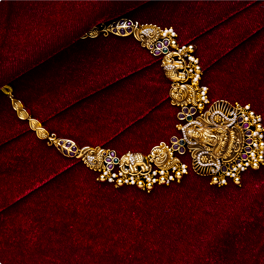 - This regal temple necklace showcases intricate artistry with a central Goddess Lakshmi pendant, flanked by elephant and floral motifs.